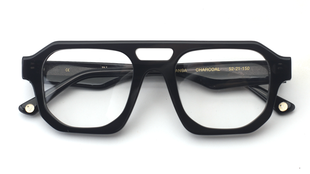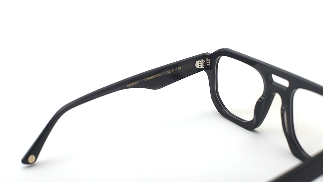 Mansa Charcoal is a bold, square-acetate frame with a modern keyhole bridge, crafted in a deep charcoal hue with subtle marbled detailing. This strong, architectural style delivers a sleek, contemporary look in a versatile dark gray color.